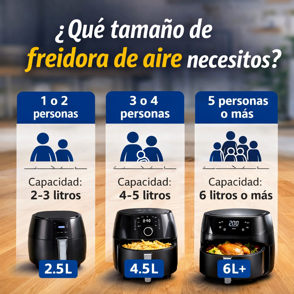 Para la mayoría de hogares, una freidora de aire de entre 4 y 5 litros ofrece un buen equilibrio entre capacidad y tamaño.